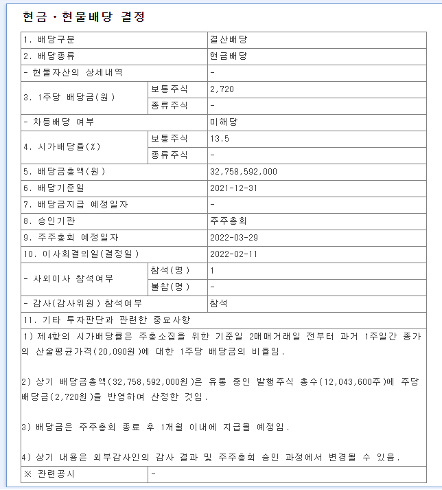 작년에는 700원 배당했는데. 올해는 보통주 1주당 2,720원이나 배당을 주네요^^ 시가배당율 13.5% 입니다.
